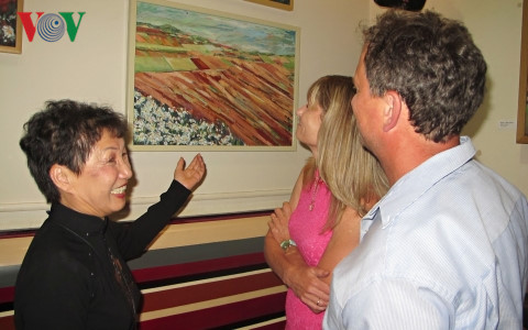 | Họa sĩ Hoàng Tuyết Hạnh giới thiệu tranh cho khách tham quan triển lãm. |