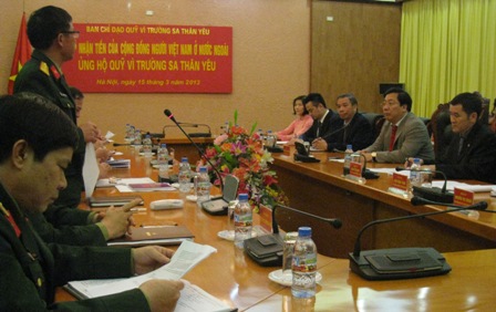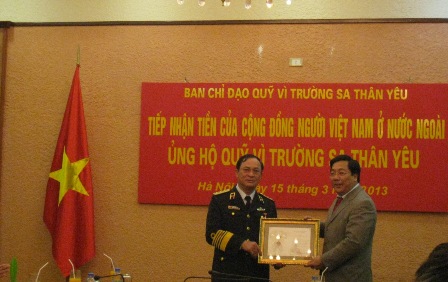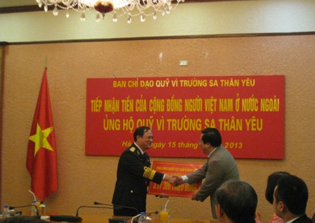 (VOV5) - Chiều 15/03, tại trụ sở Bộ Quốc phòng, Ủy ban Nhà nước về người Việt Nam ở nước ngoài, Bộ Ngoại giao tiến hành trao số tiền 3 tỷ 300 triệu đồng của cộng đồng người Việt Nam ở nước ngoài ủng hộ Quỹ “Vì Trường Sa thân yêu”. Tham dự buổi tiếp nhận có Đô đốc Nguyễn Văn Hiến, Ủy viên Trung ương Đảng, Thứ trưởng Bộ Quốc phòng, Tư lệnh Quân chủng Hải quân; Tiến sĩ Nguyễn Thanh Sơn, Thứ trưởng Bộ Ngoại giao, Chủ nhiệm Ủy ban Nhà nước về người Việt Nam ở nước ngoài.