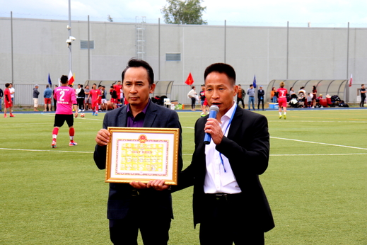 Anh Trần Anh Tuấn, chủ tịch Hội NVN tại Ba Lan khóa VI trao giấy khen của chủ nhiệm UBNNVNVNONN cho Liên đoàn bóng đá Cộng đồng VN tại Ba Lan |