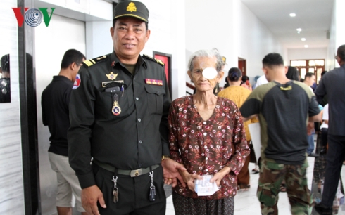 | Một sỹ quan quân đội Hoàng gia Campuchia đưa mẹ đi khám mắt. |