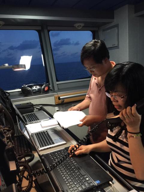 | Nhà báo Lan Phương và Hoàng Anh thực hiện bản tin chiều trên đài chỉ huy của tàu KN 490 |