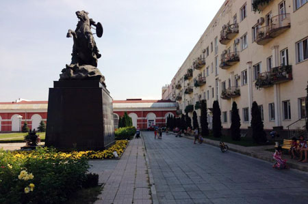 | Tượng đài Thánh Gióng trong khuôn viên làng Thời đại, nơi cư ngụ nhiều người Việt tại Kharkov (Ukraine) |