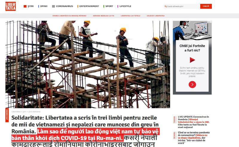 Trước tình hình dịch COVID-19 diễn biến phức tạp tại châu Âu, trong khi có hàng nghìn lao động Việt Nam đang làm việc tại Romania và đa số không biết ngôn ngữ nước sở tại, báo Libertatea.ro (Tự do) của Romania đã đăng một bài viết bằng tiếng Việt để cập nhật tình hình dịch bệnh và cung cấp thông tin cần biết cho người lao động Việt Nam tại quốc gia Trung Âu này.