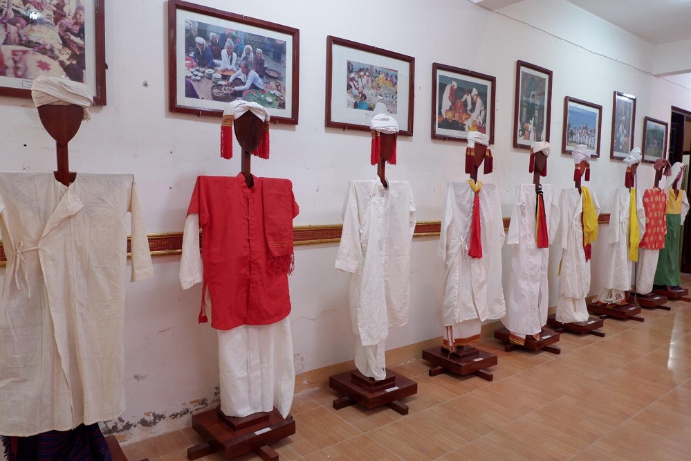 Các bộ trang phục nam được trưng bày trong khuôn viên Trung tâm nghiên cứu văn hóa Chăm