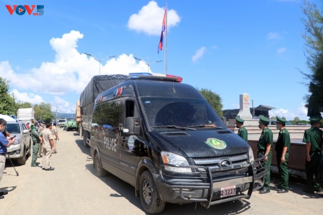 Xe ô tô của lực lượng chức năng Campuchia chở 26 người Việt Nam bàn giao tại cột mốc biên giới 275. Ảnh: PV VOV tại Campuchia |