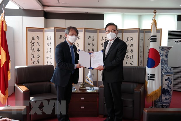 Đại sứ Nguyễn Vũ Tùng thay mặt Phó Thủ tướng, Bộ trưởng Ngoại giao Phạm Bình Minh trực tiếp trao quyết định bổ nhiệm Tổng lãnh sự danh dự cho ông Park Soo Kwan nhiệm kỳ 2019-2022. Ảnh: TTXVN |