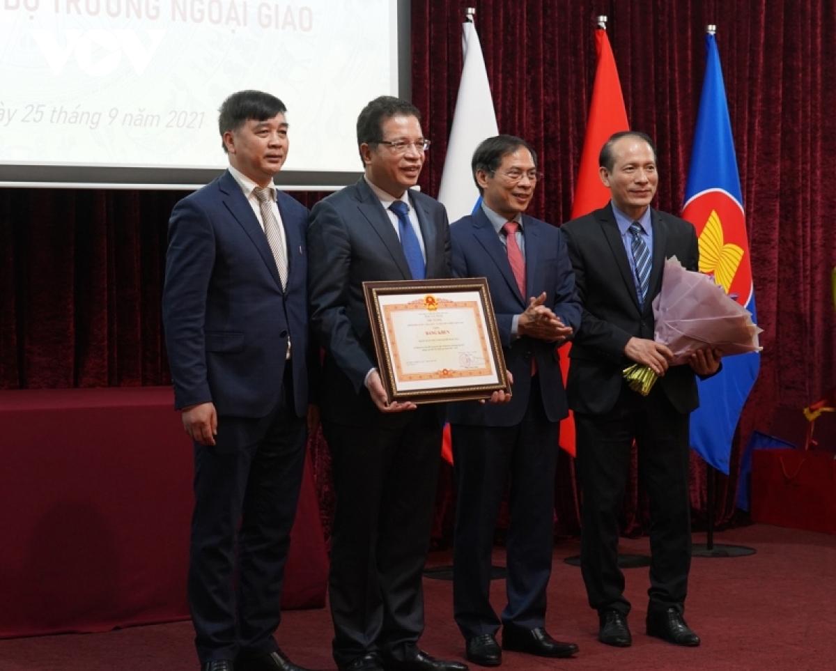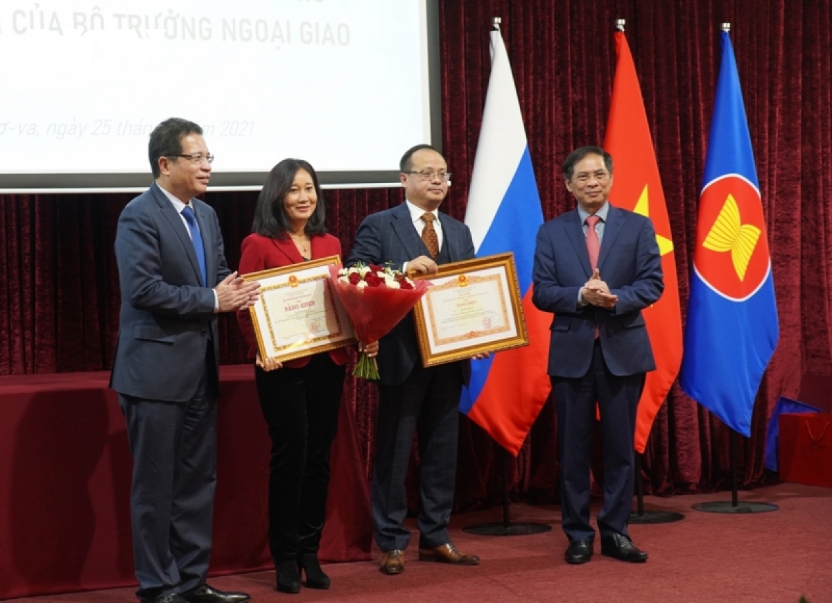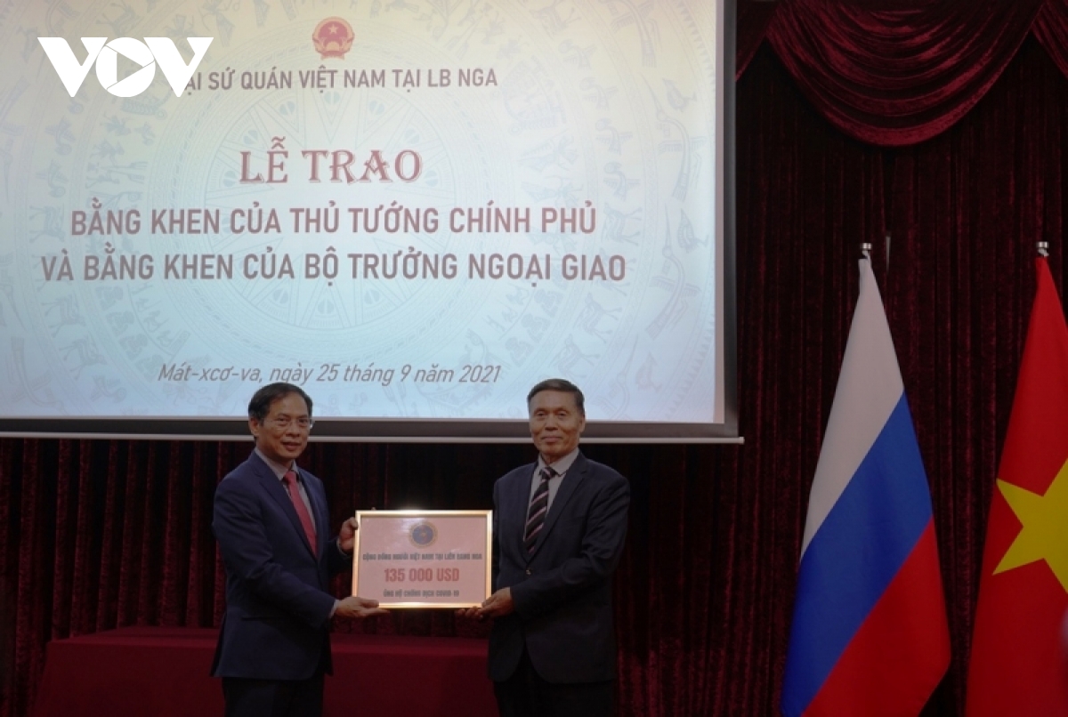 Nhân dịp này, Bộ trưởng Ngoại giao Bùi Thanh Sơn đã trao tặng Bằng khen của Thủ tướng Chính phủ cho tập thể Đại sứ quán Việt Nam tại Liên bang Nga đã có thành tích tiêu biểu trong học tập và làm theo tấm gương đạo đức Hồ Chí Minh giai đoạn 2016-2021; Bằng khen của Thủ tướng Chính phủ và của Bộ trưởng Bộ Ngoại giao cho ông Đỗ Xuân Hoàng, Chủ tịch Hội người Việt Nam tại Liên bang Nga. Cũng tại cuộc gặp, Bộ trưởng Bùi Thanh Sơn tiếp nhận tượng trưng số tiền 135.000 USD do Hội người Việt Nam tại Liên bang Nga quyên góp ủng hộ đồng bào trong nước chống đại dịch Covid-19.