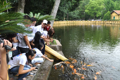 CÁc bạn trẻ kiều bào bên ao cá Bác Hồ trong ngày trở về thăm quê.Ảnh: quehuongonline |