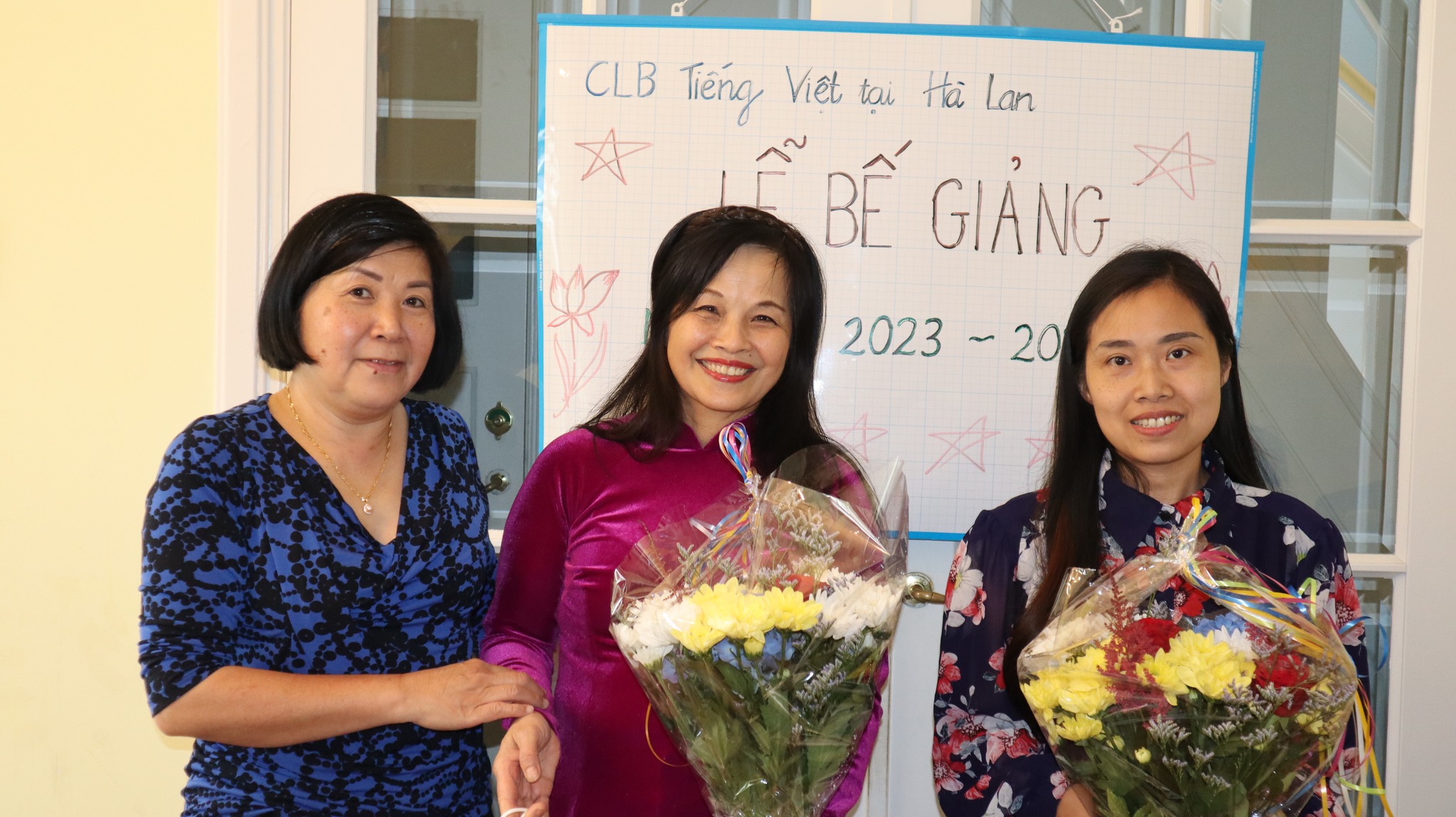 Chị Lều Thị Thu Hiền, Trưởng ban phụ huynh thành phố Den Haag và vùng phụ cận (bìa trái) tặng hoa cho các giáo viên tiếng Việt gồm cô giáo Nguyễn Thị Lan Hương (ở giữa) và cô giáo Phạm Hà Hương (bìa phải). |