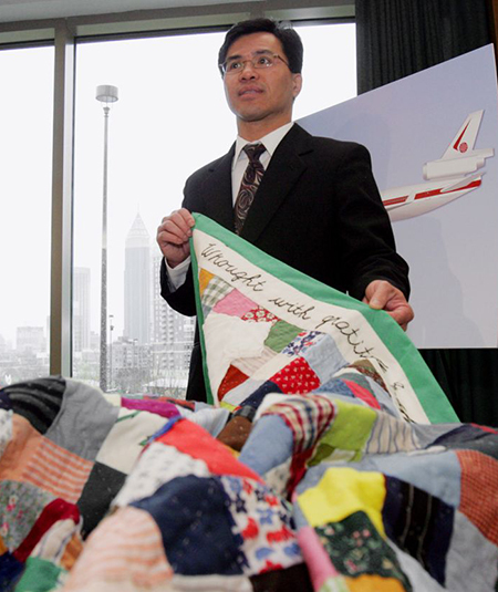 Jeff Thanh Gahr, một trong 57 trẻ em rời Việt Nam ngày 2/4/1975, tại cuộc họp báo công bố chuyến trở về quê hương của họ năm 2005. Ông giới thiệu tấm chăn được làm từ áo quần mà những đứa bé này từng mặc cách đó 30 năm khi lên máy bay sang Mỹ.
