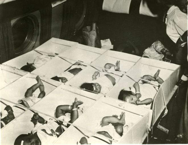 Những em lớn hơn được cho ngồi trên ghế máy bay, chèn gối và thắt dây an toàn. Ít nhất 4 phi cơ vận tải lớn đã tham gia vào "Chiến dịch Không vận trẻ em".