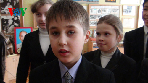 Ngày chúng tôi tới thăm trường, gặp đúng lúc có một nhóm các em học sinh Việt Nam và Ukraine đang trong giờ học về Việt Nam ngay trong Bảo tàng này. Một em học sinh lớp lớn đã chuẩn bị trước một bài hướng dẫn để kể cho các bạn về những thông tin liên quan đến vị Lãnh tụ vĩ đại của nhân dân Việt Nam, người bạn thân thiết của bạn bè Quốc tế mà Trường mang tên: Hồ Chí Minh.