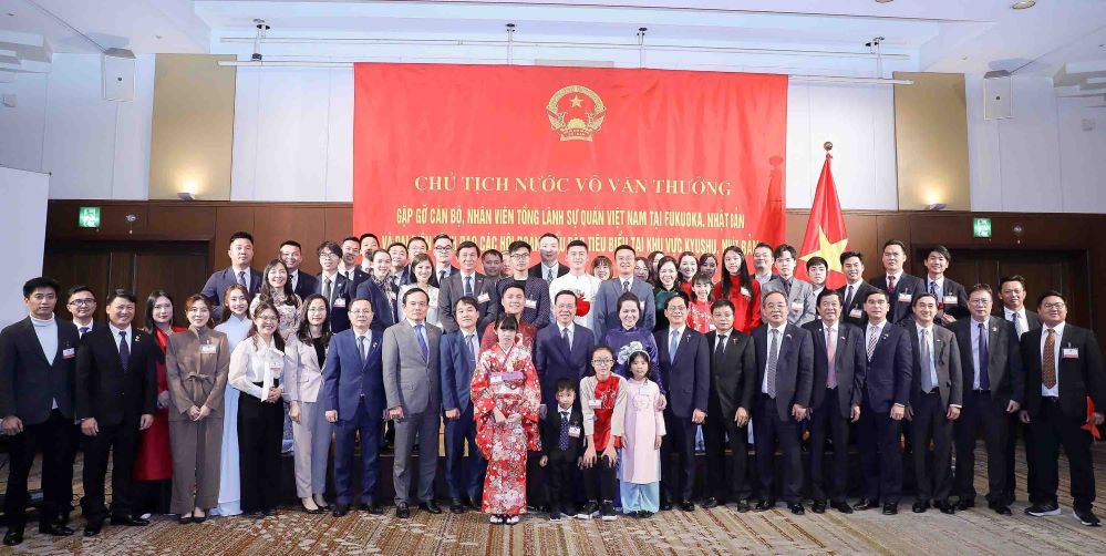 Tiếp tục chương trình thăm chính thức Nhật Bản, chiều tối nay (29/11, theo giờ địa phương), ngay khi đến tỉnh Fukuoka, Chủ tịch nước Võ Văn Thưởng đã có cuộc gặp gỡ cán bộ, nhân viên Tổng Lãnh sự quán Việt Nam tại Fukuoka và đại diện cộng đồng người Việt Nam đang sinh sống, làm việc và học tập tại khu vực Kyushu, Nhật Bản.
