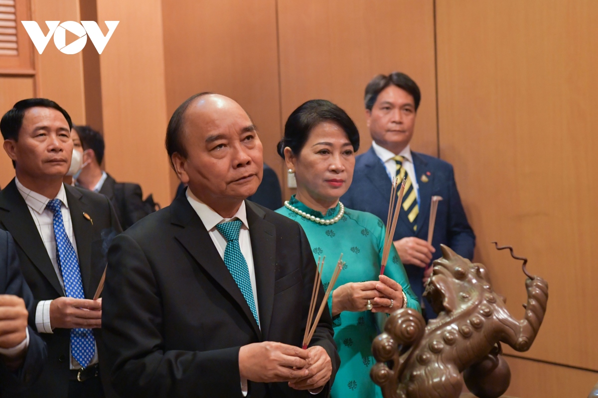Chủ tịch nước, Phu nhân và các thành viên trong Đoàn thắp hương tại Phòng thờ Chủ tịch Hồ Chí Minh. |