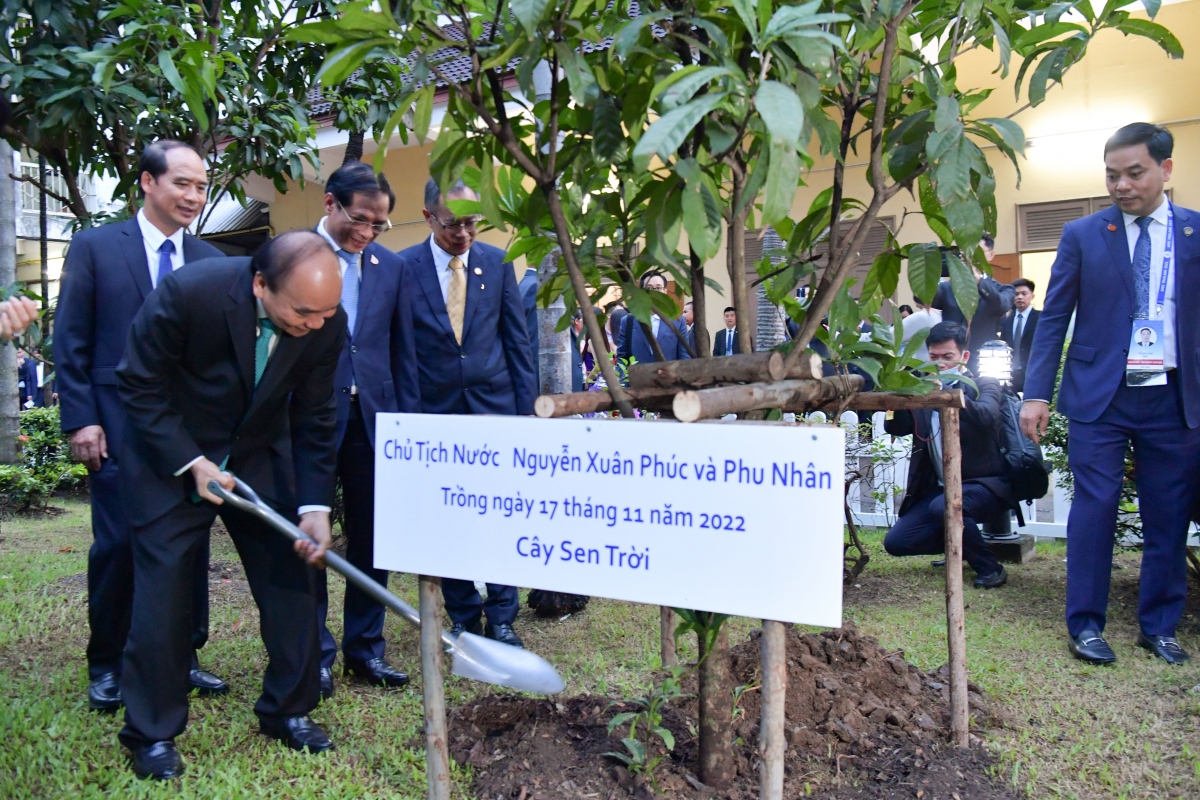 Chủ tịch nước và Phu nhân trồng cây lưu niệm trong khuôn viên Đại sứ quán. |