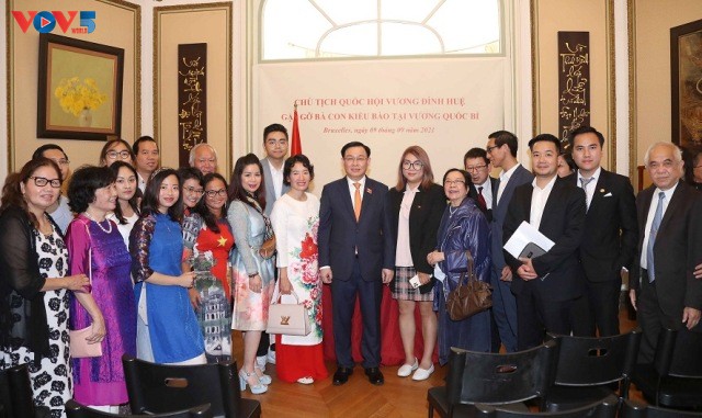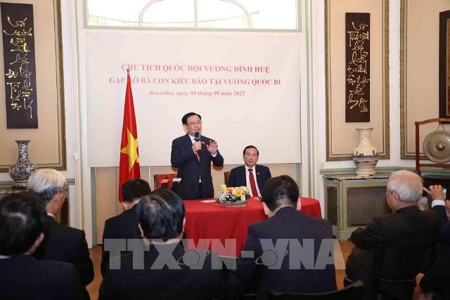 Chủ tịch Quốc hội Vương Đình gặp gỡ cộng đồng người Việt Nam tại Bỉ. Ảnh: VOV |