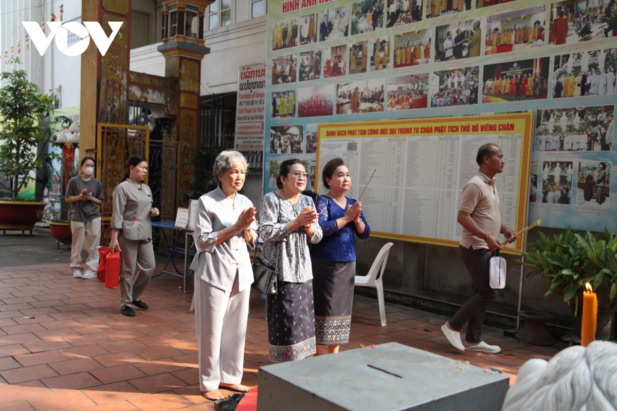 Nhân dịp này, chùa Phật tích cùng nhà hảo tâm đã trao tặng 120 suất quà, mỗi suất trị giá 400.000 Kip (khoảng hơn 500.000 đồng tiền Việt Nam) cho những người có hoàn cảnh khó khăn tại thủ đô Vientiane.