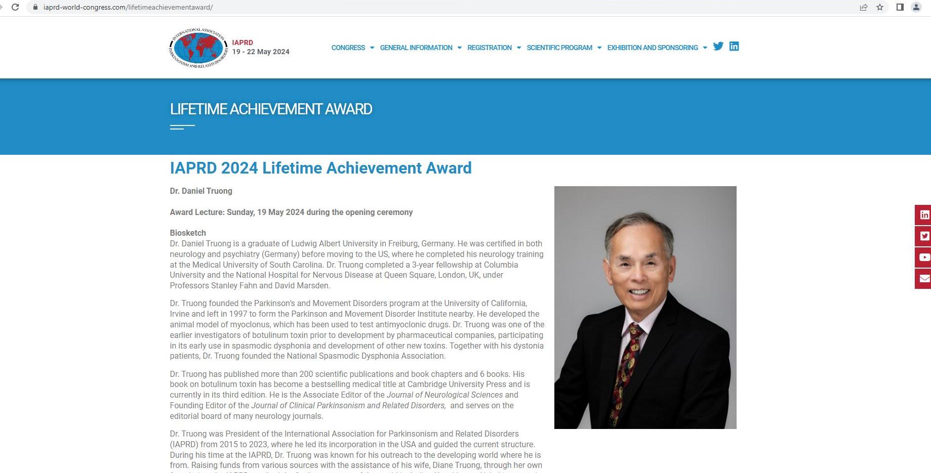 Theo thông tin từ IAPRD (Hiệp hội Parkinson quốc tế và những bệnh liên quan): Giải thưởng Thành tựu trọn đời IAPRD 2024 sẽ được trao vào ngày 19/5 tới cho bác sĩ Daniel Trương, chuyên gia thần kinh học nổi tiếng, người Việt ở Hoa Kỳ.