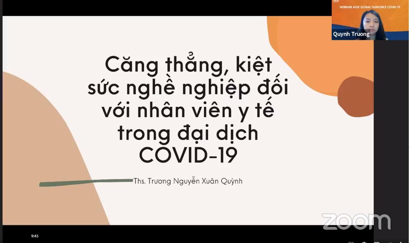 Tại hội thảo này, nói về tâm lý cho tuyến đầu chống dịch. Thạc sĩ Trương Nguyễn Xuân Quỳnh, nghiên cứu sinh tại Đại học Boston, Hoa Kỳ, nhà thực hành công tác xã hội lâm sàng trong lĩnh vực y tế khẳng định: Đại dịch covid 19 là một sang chấn tập thể. Và trong tập thể đó, việc nhận diện căng thẳng và lo âu để ứng phó là vô cùng quan trọng để bảo vệ nhân viên y tế: “Rất nhiều nghiên cứu đã chỉ ra các căng thẳng diễn ra do sang chấn tâm lý trong đại dịch có thể dẫn tới rối loạn căng thẳng hậu sang chấn. Và nếu nhân viên y tế không chăm sóc sức khỏe tinh thần hoặc được hỗ trợ đúng mức thì rối loạn có thể làm ảnh hưởng sức khỏe tinh thần của họ về sau.”