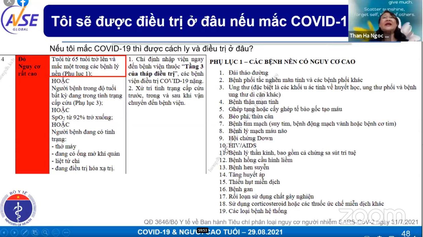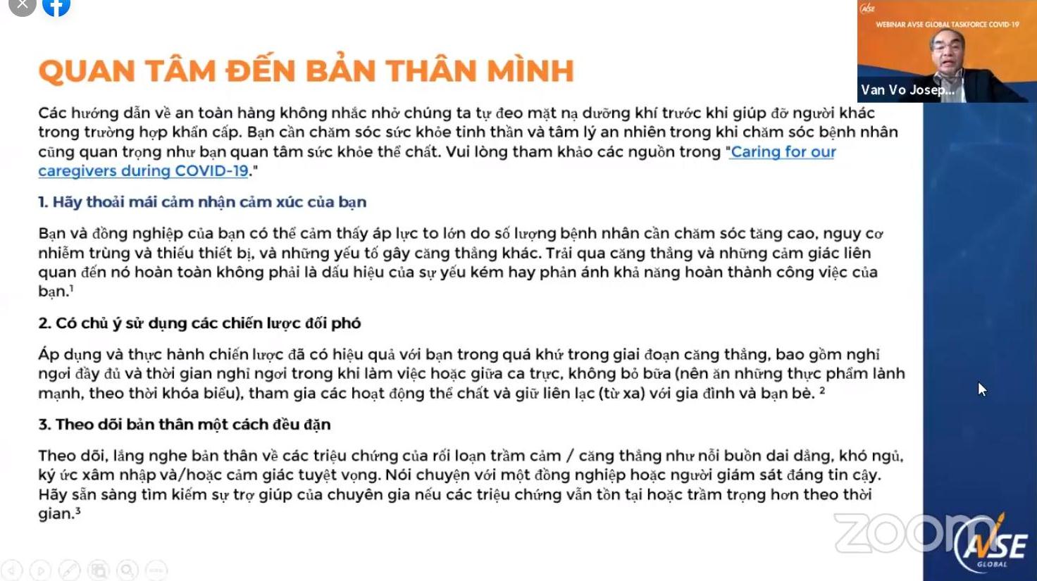 Thấu hiểu được vai trò của sức khỏe tinh thần trong cuộc chiến chống dịch, Tổ chức Khoa học và chuyên gia Việt Nam toàn cầu - AVSE Global kết hợp cùng những chuyên gia y tế đã tiếp tục tổ chức Webminar#3: Hiểu về tâm lý để an tâm giữa mùa dịch, trong đó đề cập đến những điều người cao tuổi và nhóm người dễ bị tổn thương cần biết để an tâm giữa mùa dịch; tâm lý cho tuyến đầu chống dịch; mối quan hệ gia đình - xã hội - doanh nghiệp giữa mùa dịch.