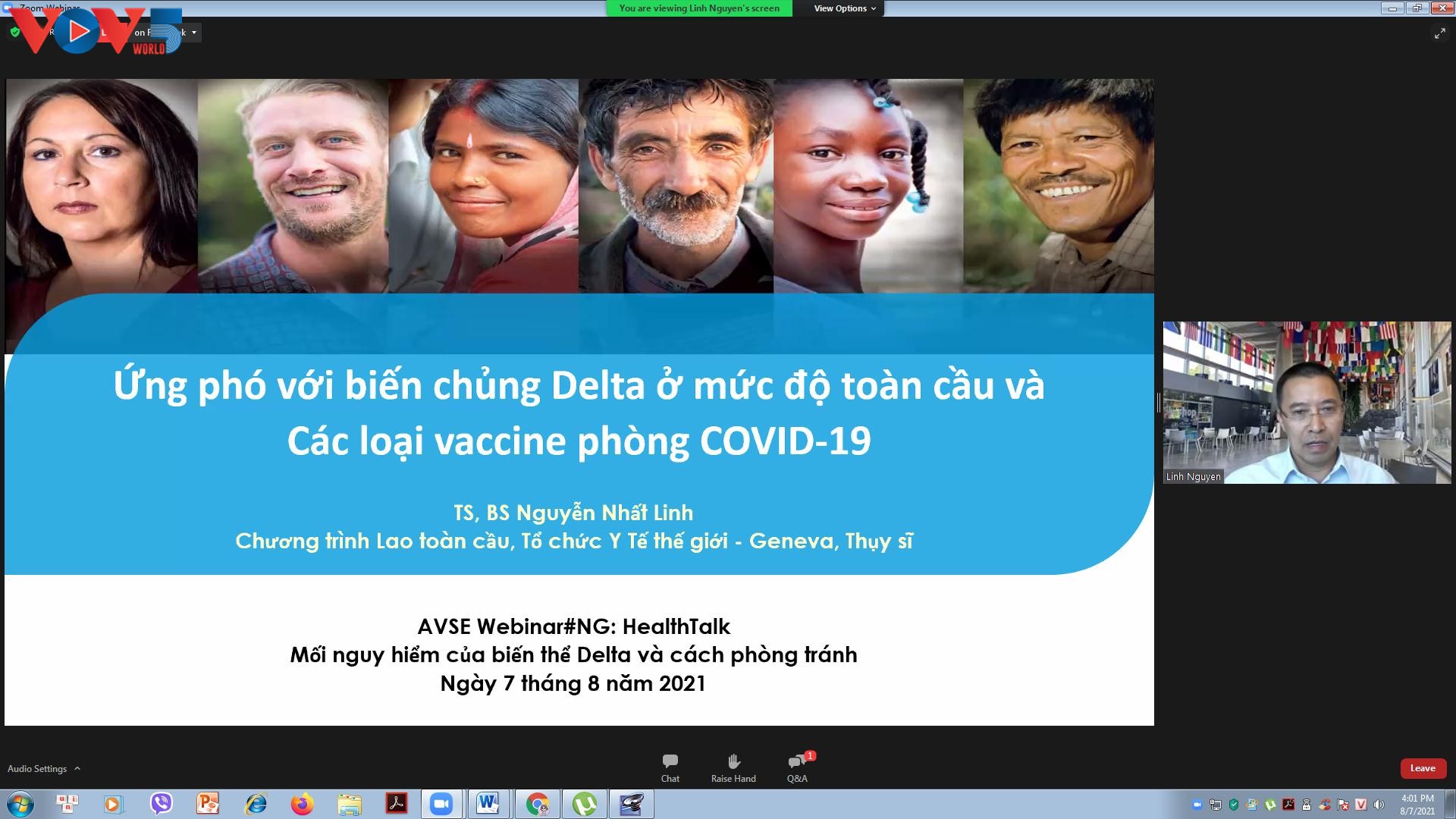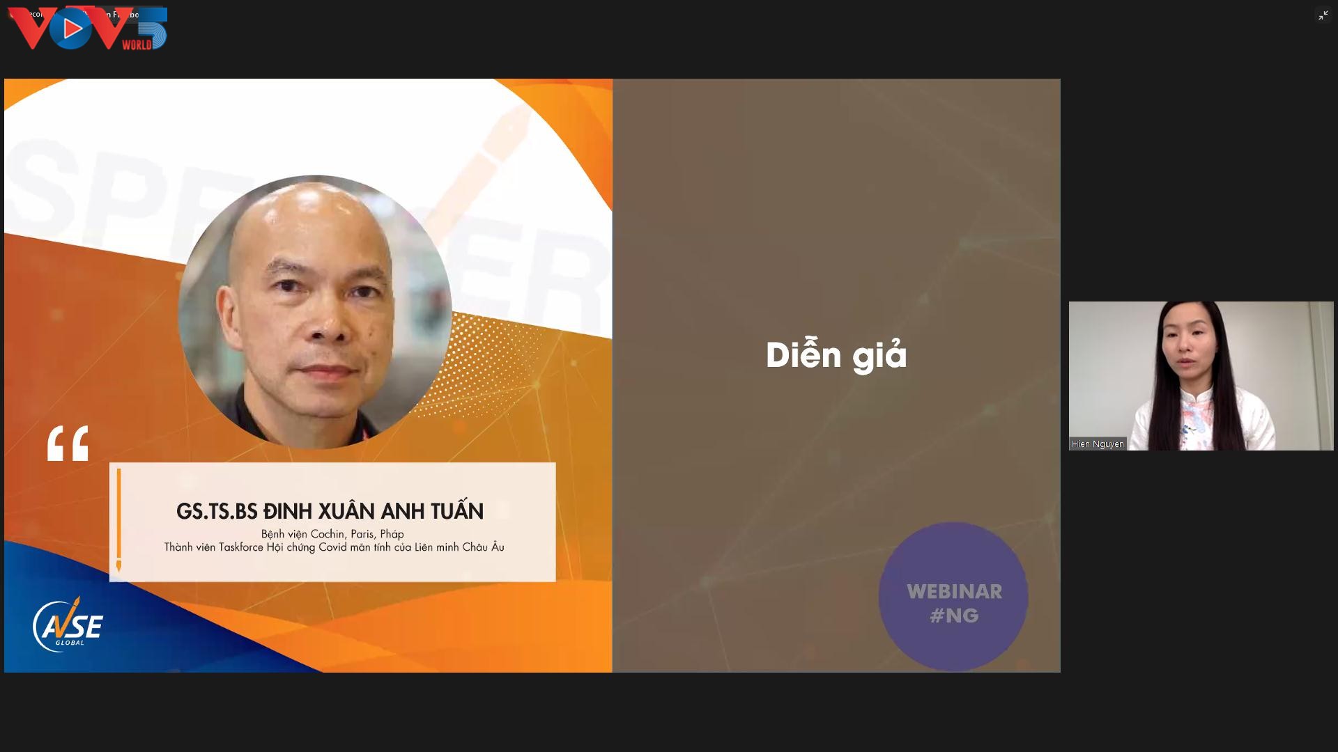 Các chuyên gia người Việt ở nước ngoài: GS.TS.BS Đinh Xuân Anh Tuấn - Bệnh viện Cochin, Paris và thành viên Taskforce Hội chứng Covid mãn tính của Liên minh Châu Âu; TS. BS. Nguyễn Nhất Linh - Chương trình chống lao toàn cầu (WHO) trả lời thính giả sau bài trình bày trong buổi hội thảo thứ 3 với chủ đề “Mối nguy hiểm của biến thể Delta và cách phòng tránh” .