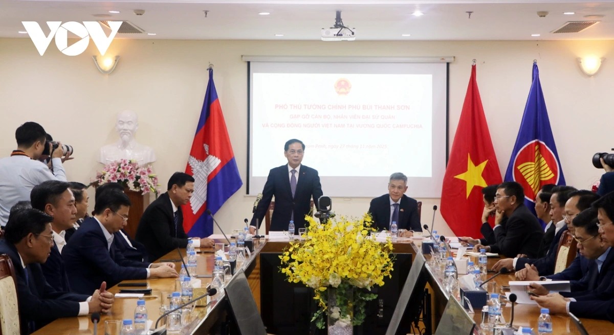 (VOV5) - Chiều tối 27/11, trong khuôn khổ chuyến thăm Campuchia, Ủy viên Trung ương Đảng, Phó Thủ tướng Chính phủ Bùi Thanh Sơn và đoàn công tác đã đến thăm và gặp gỡ cán bộ, nhân viên Đại sứ quán và cộng đồng người Việt Nam tại Campuchia.