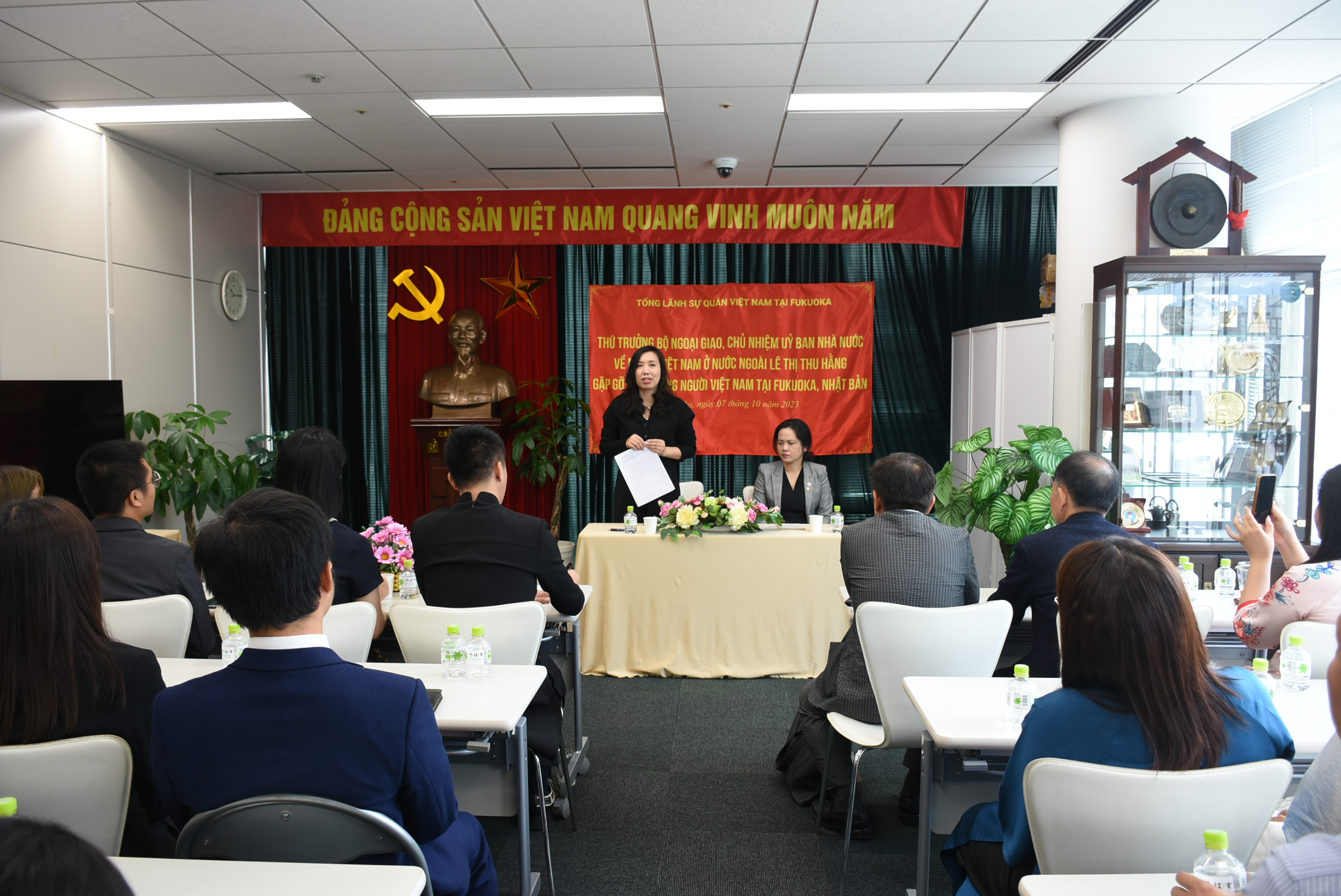 Trong khuôn khổ chuyến công tác tham dự Diễn đàn Kinh tế Kiều bào lần thứ II tại Fukuoka, Nhật Bản, ngày 07/10, Thứ trưởng Bộ Ngoại giao Lê Thị Thu Hằng - Chủ nhiệm Ủy ban Nhà nước về người Việt Nam ở nước ngoài (NVNONN), đã có buổi làm việc, tiếp xúc với đại diện cộng đồng người Việt Nam tại khu vực Kyushu.