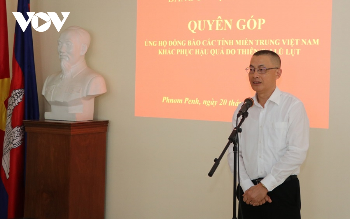 Phát biểu tại buổi lễ, Đại sứ Việt Nam tại Campuchia Vũ Quang Minh đã kêu gọi toàn bộ cán bộ, nhân viên Đại sứ quán, các cơ quan bên cạnh Đại sứ quán và cộng đồng người Việt tại Campuchia hãy vì đồng bào miền Tr ung thân yêu ruột thịt đóng góp, ủng hộ và chia sẻ những khó khăn, mất mát với đồng bào vùng thiên tai.