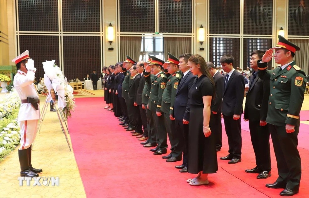 Đoàn đại biểu Đại sứ quán Việt Nam, các cơ quan bên cạnh Đại sứ quán và cộng đồng người Việt Nam tại Lào viếng đồng chí Khamtay Siphandone. Ảnh: Xuân Tú/TTXVN |