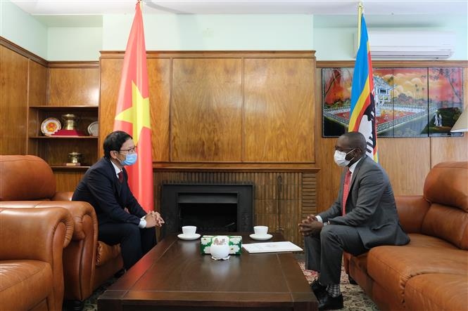 Đại sứ Việt Nam tại Nam Phi Hoàng Văn Lợi và Đại biện lâm thời Eswatini tại Nam Phi Vulindlela S. Kunene trao đổi tình hình dịch bệnh Covid-19 tại hai nước. Ảnh: Hồng Minh |