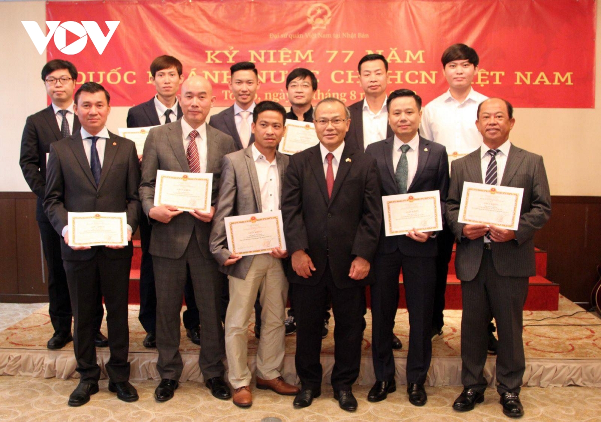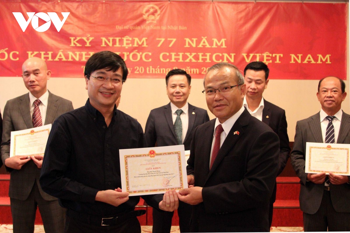Cũng nhân dịp này, Đại sứ Vũ Hồng Nam đã trao tặng giấy khen cho 6 tập thể và 32 cá nhân đã có nhiều đóng góp cho cộng đồng người Việt Nam tại Nhật Bản.