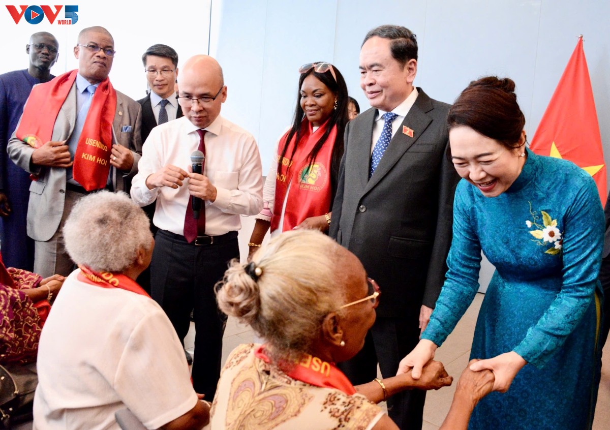 Chủ tịch Quốc hội Trần Thanh Mẫn và Phu nhân trò chuyện với cộng đồng người Việt Nam tại Senegal. Ảnh: Lê Tuyết/VOV |