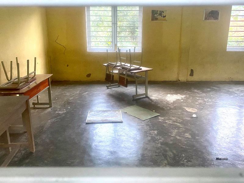 Phòng học ở điểm chính trường mầm non Hoa Mai, nhiều ngày sau cơn lũ đi qua nhưng vẫn còn để lại ngấn nước trên những bức tường |