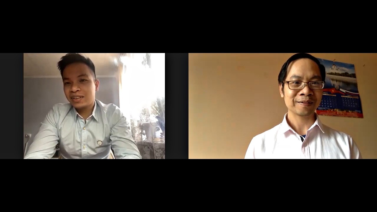 Hoàng Phi Hùng (trái) trao đổi trực tuyến với phóng viên TTXVN tại Nga. Ảnh chụp màn hình. |