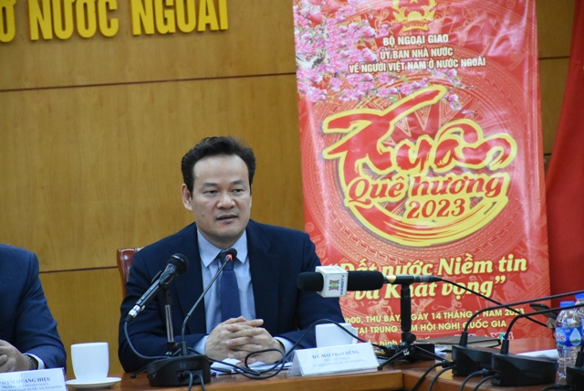 Tiếp đó, Phó Chủ nhiệm Ủy ban Nhà nước về Người Việt nam ở nước ngoài Mai Phan Dũng đã thông tin về ý nghĩa và nội dung của chương trình Xuân quê hương 2023. Với chủ đề “ Đất nước niềm tin và khát vọng”, sự kiện sẽ diễn ra vào ngày 14/01/2023 (tức ngày 23 tháng chạp năm Nhâm Dần tại Trung tâm Hội nghị Quốc gia, Hà Nội, với sự tham gia của 3 ngàn đại biểu, trong đó có 1 ngàn đại biểu là người Việt Nam ở nước ngoài. Cũng tại buổi gặp gỡ, lãnh đạo Ủy ban trả lời câu hỏi của phóng viên các cơ quan thông tấn, báo chí về một số nội dung như: thu hút kiều hối, việc hỗ trợ cộng đồng người gốc Việt tại Campuchia, cuộc sống của người Việt tại Ucraina và tổ chức đoàn kiều bào thăm Trường Sa.