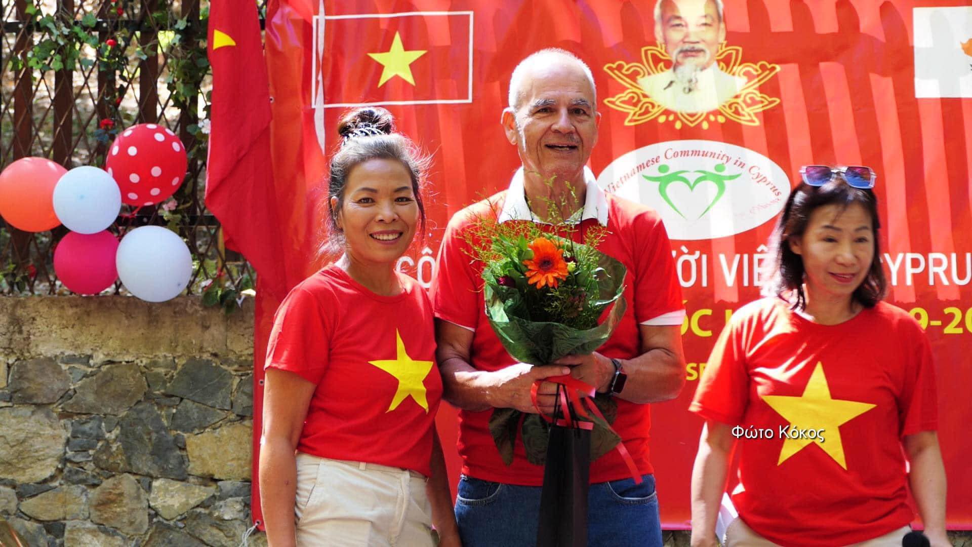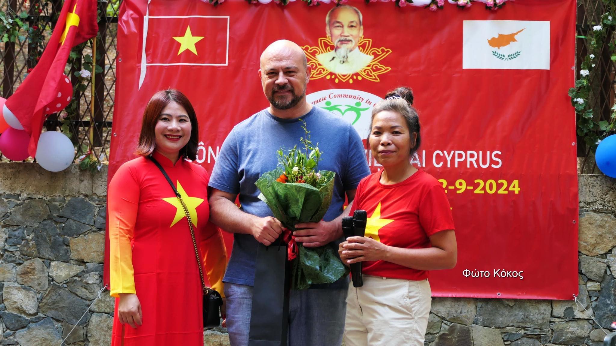 Lãnh sự danh dự Việt Nam tại CH Sip nhận bó hoa tươi thắm từ đại diện Ban lãnh đạo Cộng đồng Việt Nam tại Síp. |