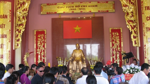 Tại khu di tích Xiengvang, nhiều đoàn người đã tề tựu xếp hàng vào Ban thờ Bác dâng hương hoa, tưởng niệm và báo công với Bác.