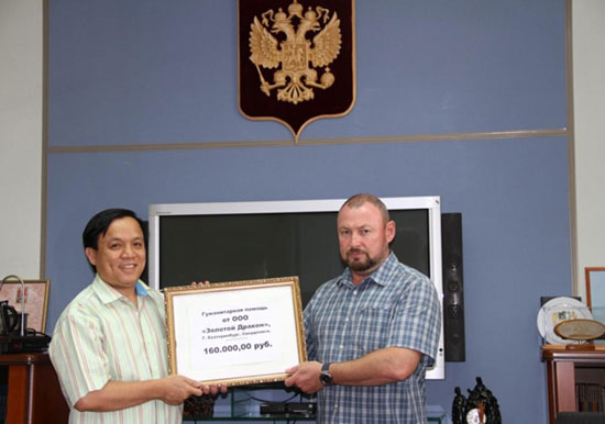 | Ông Hoàng Văn Vinh -Chủ tịch Hội Người Việt Nam ở Ekateringburg trao quà cứu trợ, ủng hộ nhân dân vùng Kuban |