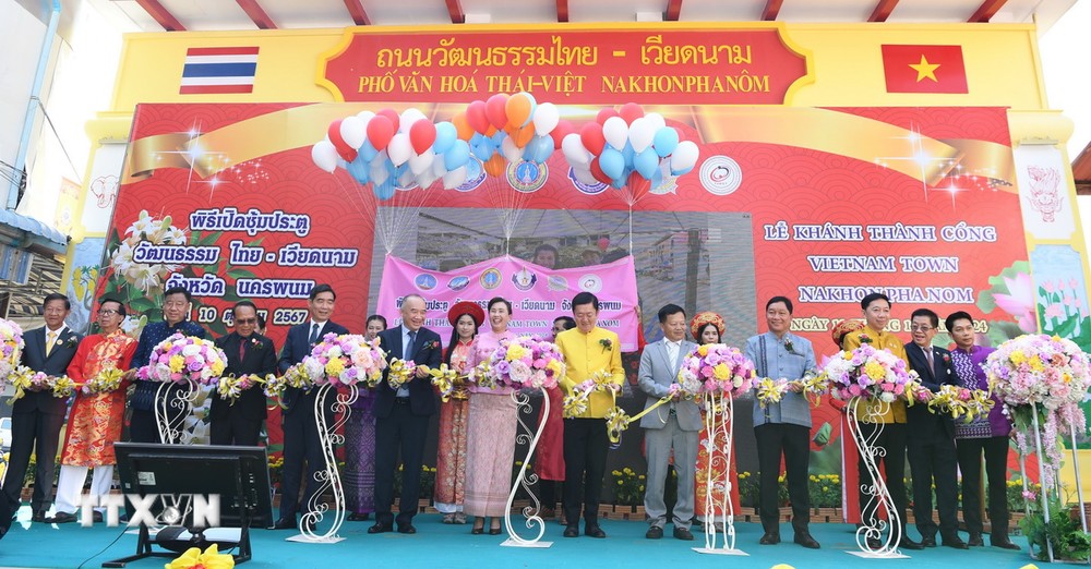 Các đại biểu cắt băng khánh thành Cổng Phố văn hóa Thái Lan-Việt Nam tại tỉnh Nakhon Phanom. Ảnh: Huy Tiến/TTXVN |