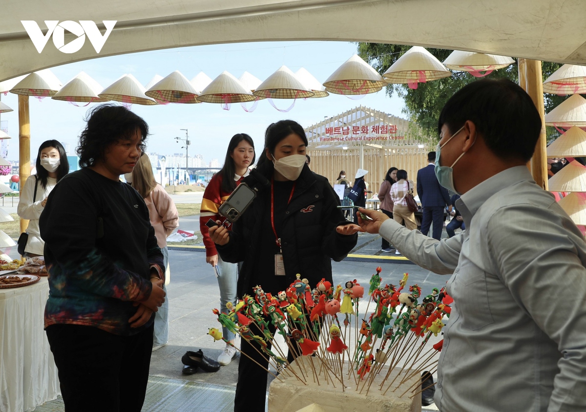 Du khách Hàn Quốc trải nghiệm văn hóa Việt. Ảnh: VOV |