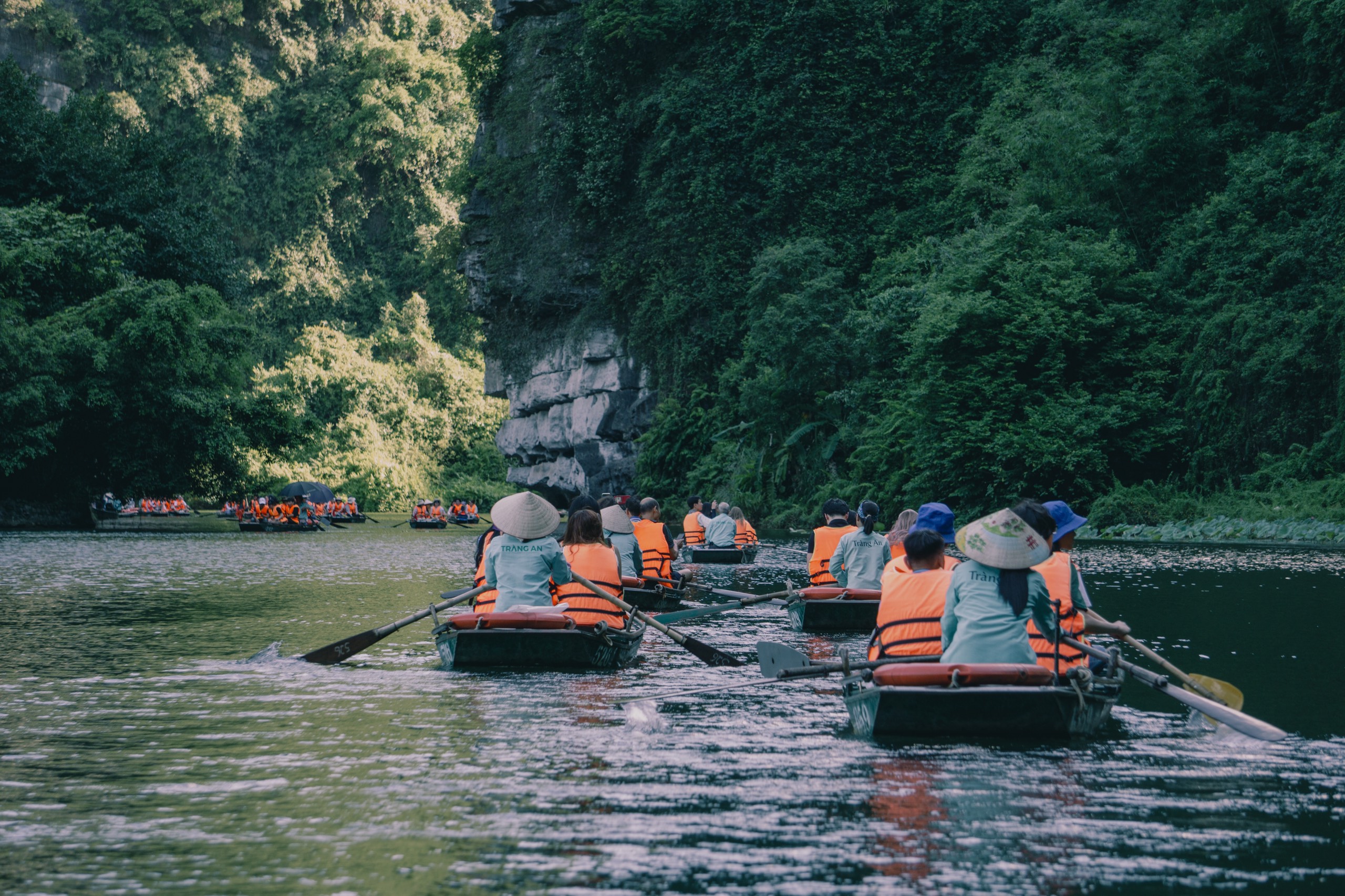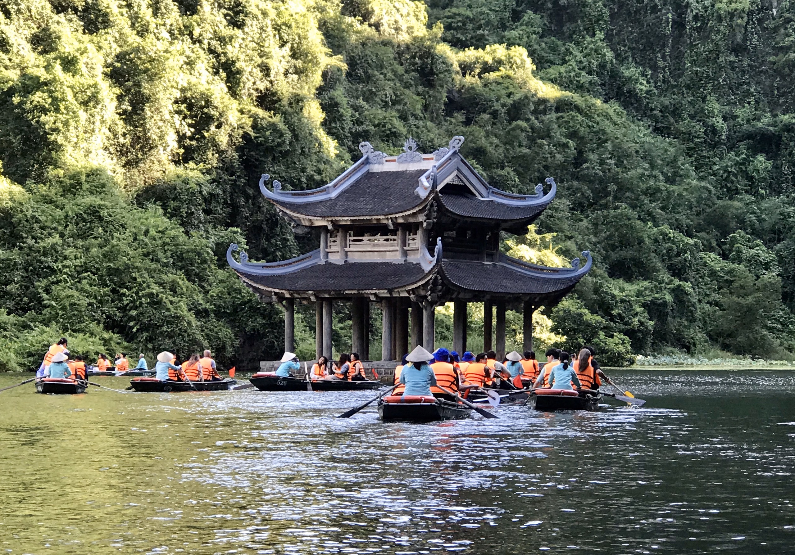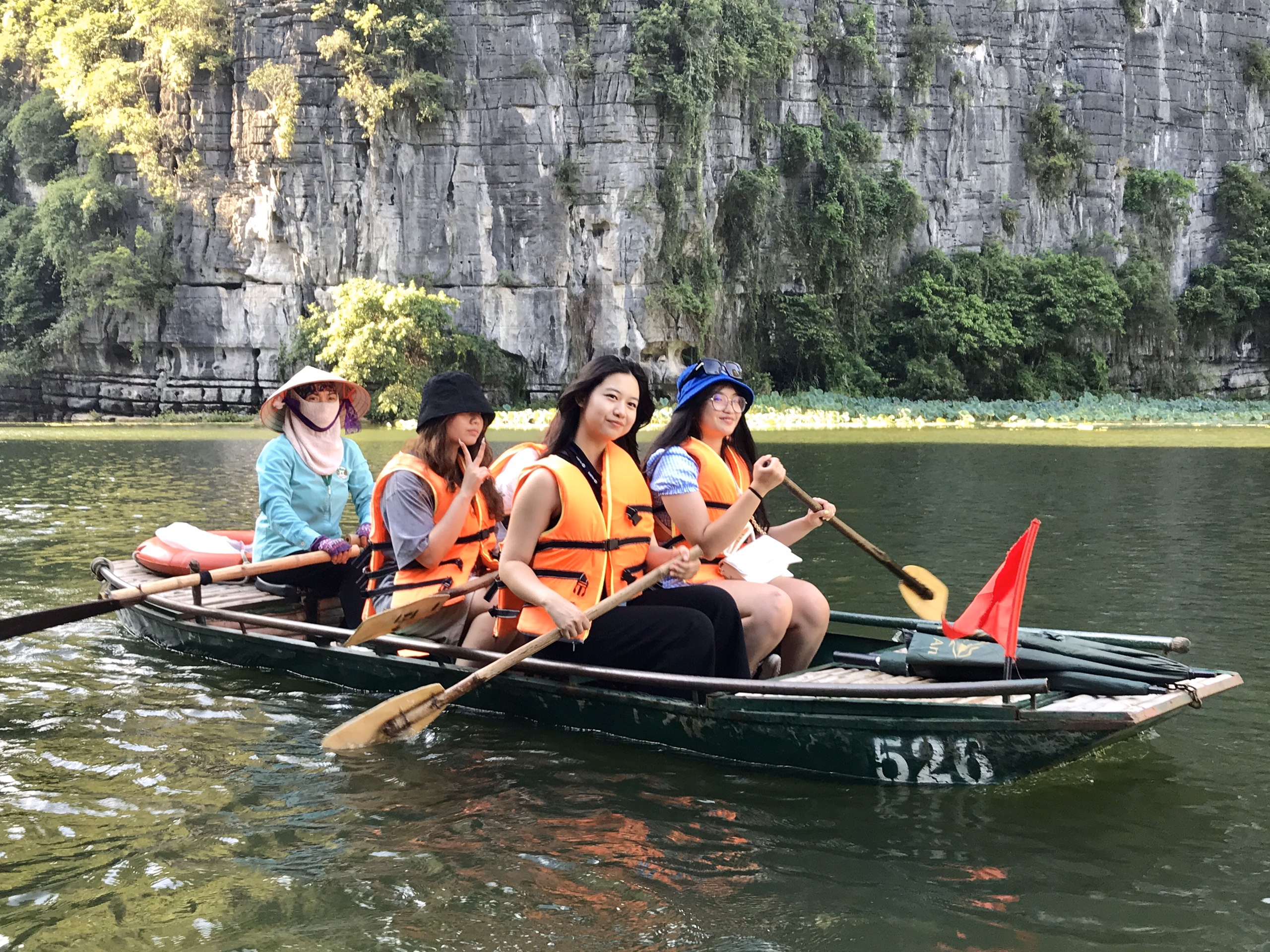 Các bạn trẻ có thời gian hai tiếng ngồi thuyền thăm khu du lịch sinh thái Tràng An. |