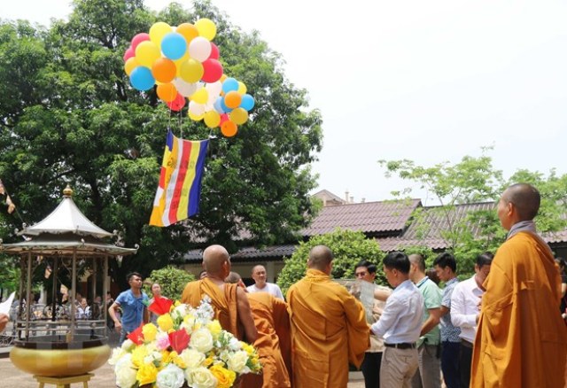 Các tăng ni, Phật tử cùng nhau thực hiện nghi thức phóng sinh chim và thả bóng cầu nguyện thế giới luôn hòa bình, người dân an lạc, đau khổ khép lại, hạnh phúc mở ra. (Ảnh: Xuân Tú/TTXVN) |