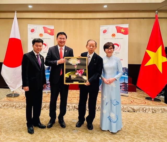 Nhân dịp này, Đại sứ Phạm Quang Hiệu (thứ hai từ trái sang) đã trân trọng chuyển quà của Thủ tướng Phạm Minh Chính tới Chủ tịch Nikai. |