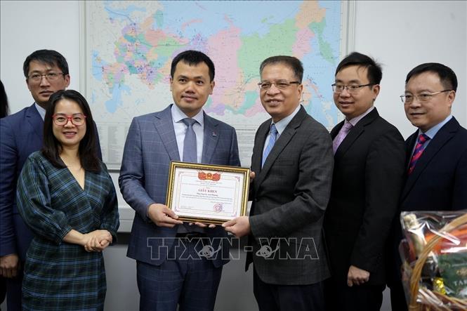 Đại sứ Đặng Minh Khôi (thứ 3 từ phải qua) tặng bằng khen cho ông Nguyễn Anh Phương, Trưởng văn phòng đại diện Tập đoàn dầu khí Việt Nam tại LB Nga. Ảnh: TTXVN |