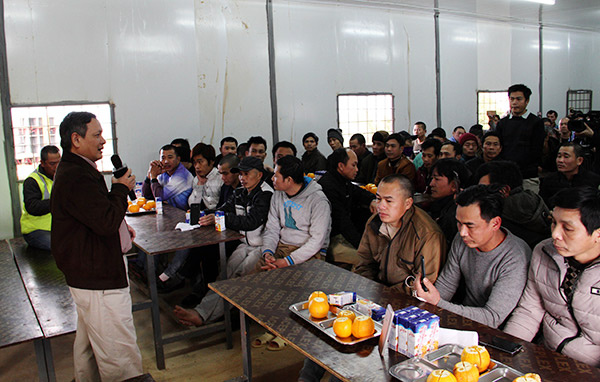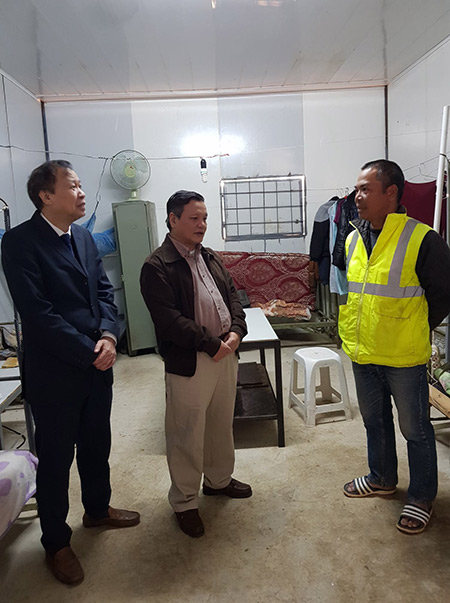 Gần 200 công nhân làm việc tại công trường đã vui mừng đón tiếp đoàn và tham dự cuộc gặp mặt chung. Đại sứ Phạm Quốc Trụ đã trao tặng anh em công nhân quà tết và chúc mừng năm mới toàn thể anh em công nhân công trường. Đại sứ và đoàn ân cần thăm hỏi tình hình gia đình, điều kiện ăn ở và làm việc của anh em công nhân Việt Nam, thăm nơi ăn ở của công nhân và công trình đang xây dựng. Đại sứ bày tỏ mong muốn anh em công nhân nỗ lực khắc phục khó khăn, làm việc tốt, chấp hành các quy định của công trường, luật pháp và phong tục văn hóa sở tại, hợp tác với chủ sử dụng và công nhân ở sở tại, tránh các hành động gây bất hòa hoặc làm phức tạp quan hệ, duy trì liên hệ với Đại sứ quán để có sự hướng dẫn và hỗ trợ cần thiết.