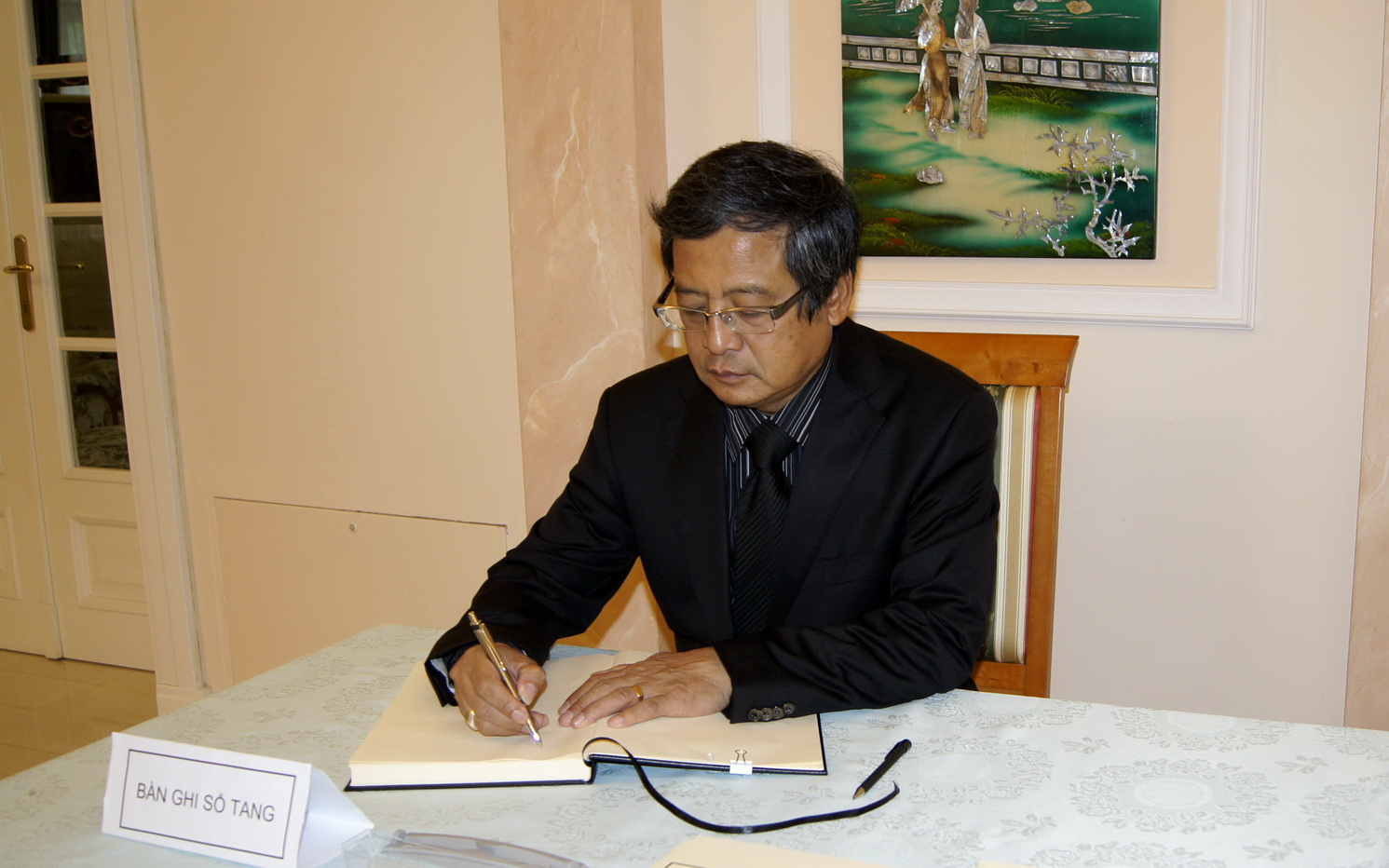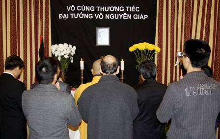 Đại diện các tổ chức Hội đoàn, cán bộ Đại sứ quán, bạn bè quốc tế và bà con đã viết vào sổ tang tỏ lòng tiếc thương và cảm phục vị tướng huyền thoại của dân tộc.