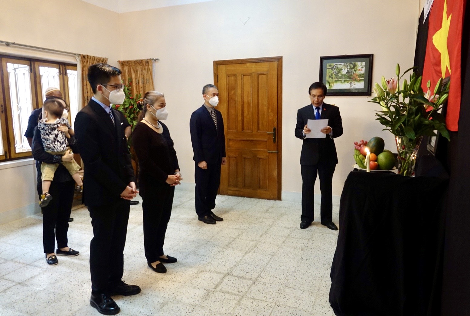 Cán bộ, nhân viên Đại sứ quán dành một phút mặc niệm tưởng nhớ nguyên Tổng Bí thư Lê Khả Phiêu. |