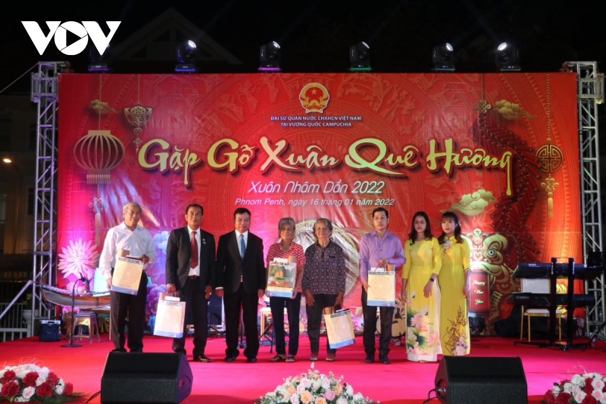 Nhân dịp này, Đại sứ Nguyễn Huy Tăng thay mặt Đại sứ quán trao tặng món quà tình nghĩa thể hiện sự tri ân đối với 5 gia đình người gốc Việt có nhiều đóng góp cho công tác Hội, cộng đồng người gốc Việt tại Campuchia và sự nghiệp cách mạng Việt Nam.