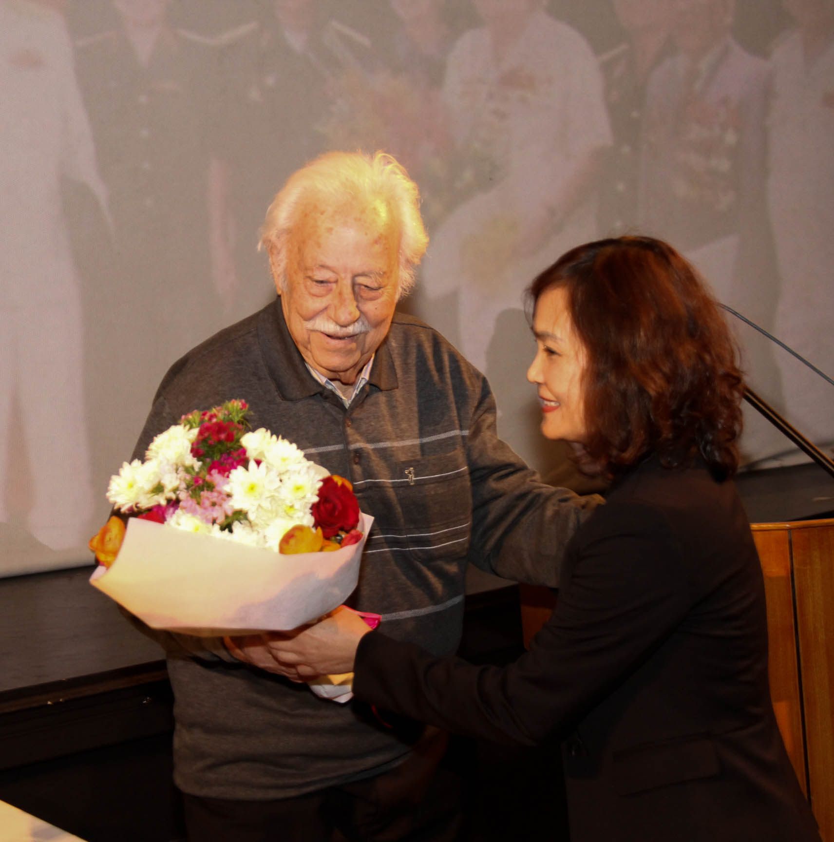 | Ông Kostas nhận hoa chúc mừng trong buổi trình chiếu phim "Viet Kostas" |