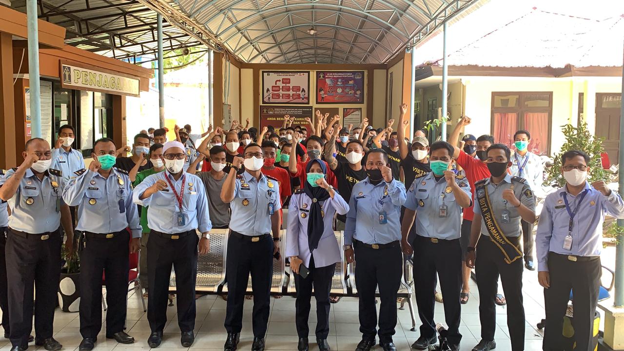 Cán bộ quản lí trại tạm giữ Pontianak cùng ngư dân Việt Nam. Ảnh nguồn: Đại sứ quán Việt Nam tại Indonesia |